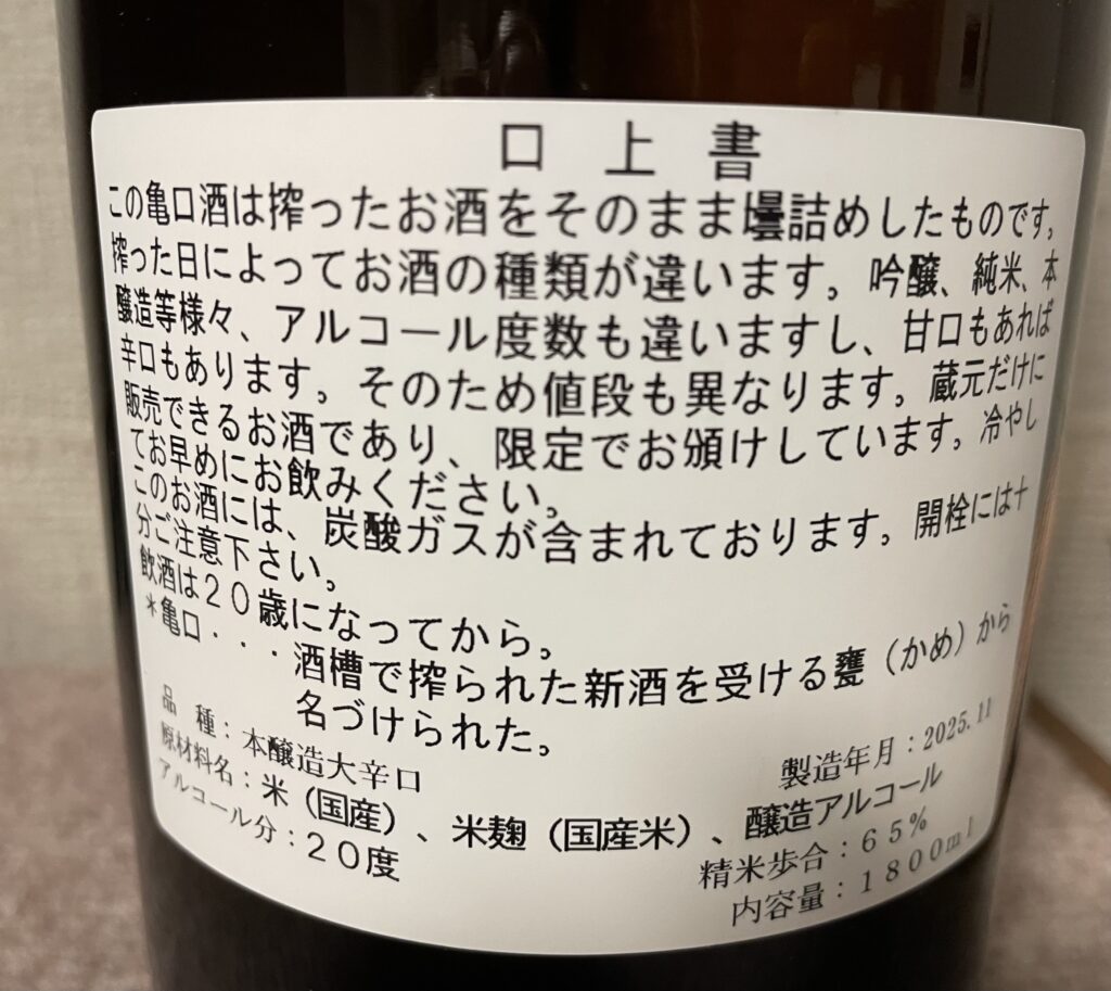 この小澤酒造が12月中旬頃から4月下旬までの期間限定で販売される「亀口酒」しかも現地でしか購入できない限定品!さらに搾った日によって純米だったり、本醸造だったり、吟醸だったり、特に搾るスケジュールが公表されているわけではないのでその日に何が手に入るのかわからず行ってからのお楽しみ♪