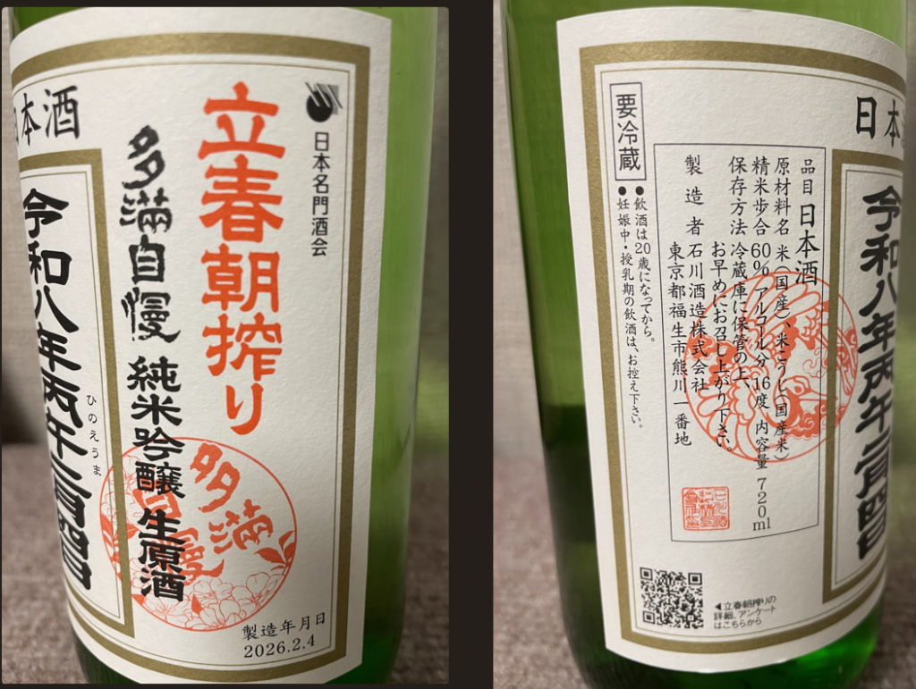 毎年楽しみにしている、立春朝搾り。青梅線の拝島駅から徒歩5~20分くらいの場所にある石川酒造で醸したもの。